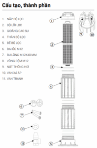 | Thành phần | Vỏ, lõi lọc và bộ phụ kiện |